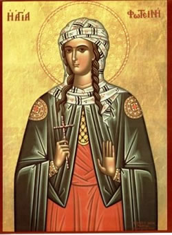 Χαίροις Ἰσαπόστολε Φωτεινή, ἡ ζωῆς τό ὕδωρ, δεξαμένη παρά Χριστοῦ· χαίροις ἡ ἐν Ῥώμῃ, ἀθλήσασα ἀνδρείως, σύν πᾶσι τοῖς οἰκείοις, Χριστός δοξάσασα.