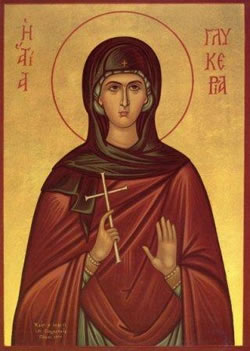 Τήν παρθένον στέργουσα, καί Θεοτόκον Μαρίαν, διετήρεις ἄφθορον, τήν σεαυτῆς παρθενίαν· πόθῳ δέ, καρδιωθεῖσα τῷ τοῦ Κυρίου, ἤθλησας, ἀνδρειοφρόνως μέχρι θανάτου· διά τοῦτο Γλυκερία, διπλῷ στεφάνῳ, σέ στέφει Χριστός ὁ Θεός.