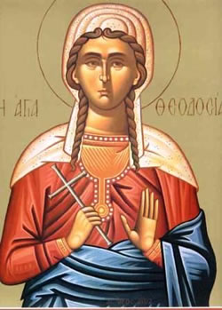Ἁγία Παρθενομάρτυς Θεοδοσία καταγόταν ἀπό τήν Τύρο τῆς Φοινίκης καί ἄθλησε κατά τούς χρόνους τοῦ αὐτοκράτορος Διοκλητιανοῦ (284 – 305 μ.Χ.). Σέ ἡλικία δέκα ὀκτώ ἐτῶν διέπρεπε τόσο γιά τήν εὐσέβεια, ὅσο καί γιά τό ζῆλο της ὑπέρ τῆς Χριστιανικῆς πίστεως, διαδίδοντας αὐτή μεταξύ τῶν εἰδωλολατρισσῶν γυναικῶν καί ἑλκύοντας πολλές ἀπό αὐτές. Κατά τό πέμπτο ἔτος τῶν διωγμῶν, βρισκόμενη στήν Καισάρεια τῆς Παλαιστίνης, συνελήφθη καί δέσμια ὁδηγήθηκε ἐνώπιον τοῦ ἄρχοντος Οὐρβανοῦ. Ἐπειδή ἡ Ἁγία δέν πειθόταν νά θυσιάσει στά εἴδωλα, διατάχθηκε ὁ σκληρός βασανισμός αὐτῆς. Τῆς κόπηκαν οἱ μαστοί καί τῆς καταξεσκίσθηκαν τά πλευρά, ἡμιθανής δέ, πιεζόταν νά ἀπαρνηθεῖ τόν Χριστό. Ἡ Θεοδοσία, μέ φωνή πού μόλις ἀκουγόταν, δήλωσε καί πάλι ὅτι ἦταν καί θά παρέμενε Χριστιανή. Τότε ὁ Οὐρβανός, γεμάτος ἀπό ὀργή, διέταξε, ἀφοῦ βασανισθεῖ σκληρότερα, νά ριχθεῖ στή θάλασσα, ὅπου ἔλαβε καί τόν στέφανο τοῦ μαρτυρίου.
