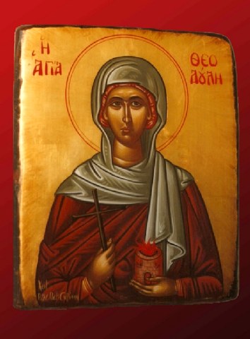 Ἁγία Μάρτυς Θεοδούλη καταγόταν ἀπό τά Ἀνάζαβρα καί ἔζησε στά χρόνια τοῦ αὐτοκράτορα Διοκλητιανοῦ (284 – 305 μ.Χ.). Ἐπειδή διακήρυττε τήν πίστη της στόν Χριστό, συνελήφθη καί ὁδηγήθηκε ἐνώπιον τοῦ Πελαγίου, ἡγεμόνα τῶν Ἀναζάβρων, καί μπροστά στόν ἡγεμόνα, ἡ Θεοδούλη, διακήρυξε τήν πίστη της στόν Ἅγιο Τριαδικό Θεό. Τότε ὑποβλήθηκε σέ φοβερά βασανιστήρια. Τῆς τρύπησαν μέ πυρακτωμένα σουβλιά τούς μαστούς, ἔπειτα τήν κρέμασαν ἀπό τά μαλλιά σέ ἕνα κυπαρίσσι καί τῆς κάρφωσαν τά πόδια μέ σιδερένια καρφιά. Κατόπιν τήν ἔριξαν μαζί μέ ἄλλους Ἁγίους μέσα σέ ἀναμμένο καμίνι.